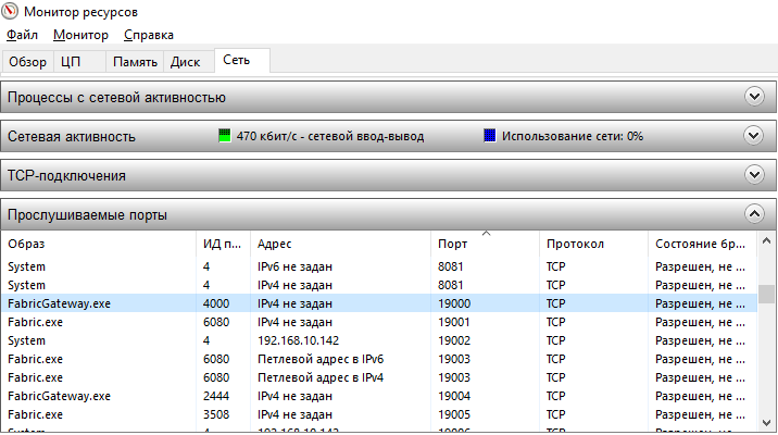 Для выхода из ситуации можно воспользоваться Монитором ресурсов Windows и отслеживать открытые TCP-порты. Когда среди них присутствует порт 19000, кластер доступен для подключения с помощью Connect-ServiceFabricCluster.
