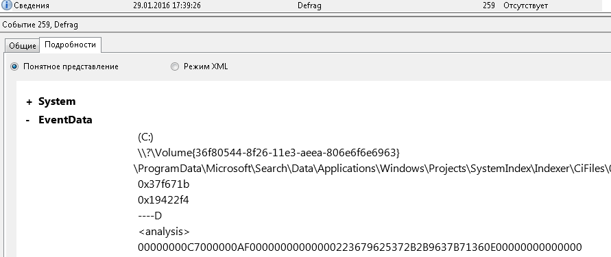 Данные эти находятся под событием с именем Defrag и кодом 259.