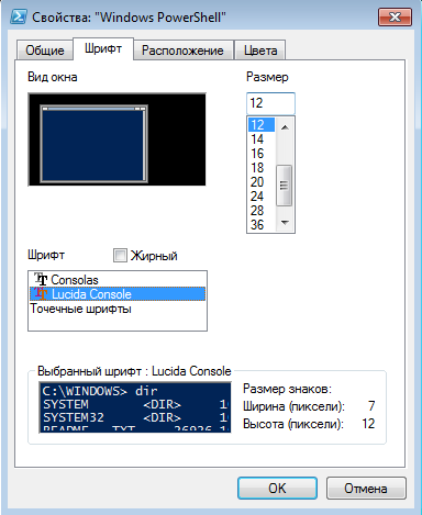3. Выбор шрифта Lucida Console в Properties(Свойствах) консоли