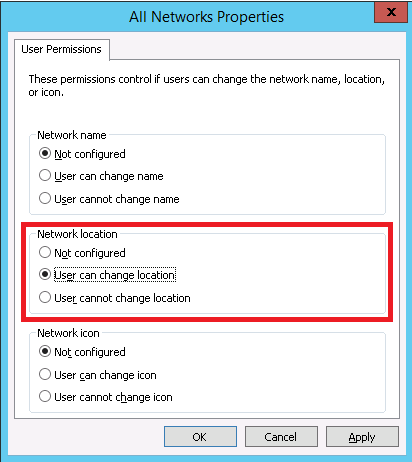 По умолчанию в современных серверных операционных системах семейства Windows категория сети (тип сетевого подключения) определяется автоматически (Network Location Awareness (NLA)). Возможность ручного изменения типа сети становится доступна после изменения политик безопасности целевой локальной системы или групповых политик применяемых на целевую систему.