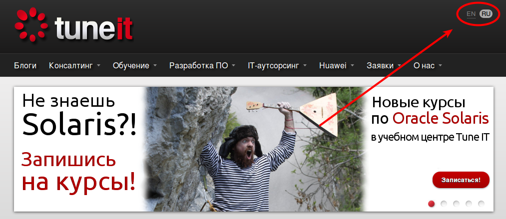 Если вы посмотрите в правый верхний угол любой страницы нашего сайта, то увидите там виджет смены локализации: