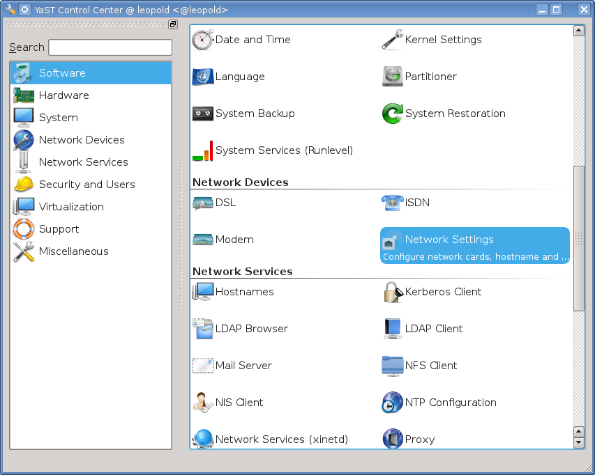 Даже те, кто ни разу не использовал openSUSE знают, что почти все здесь можно сделать через панель управления YaST. Итак, выберем элемент Network Settings в разделе Network Devices: