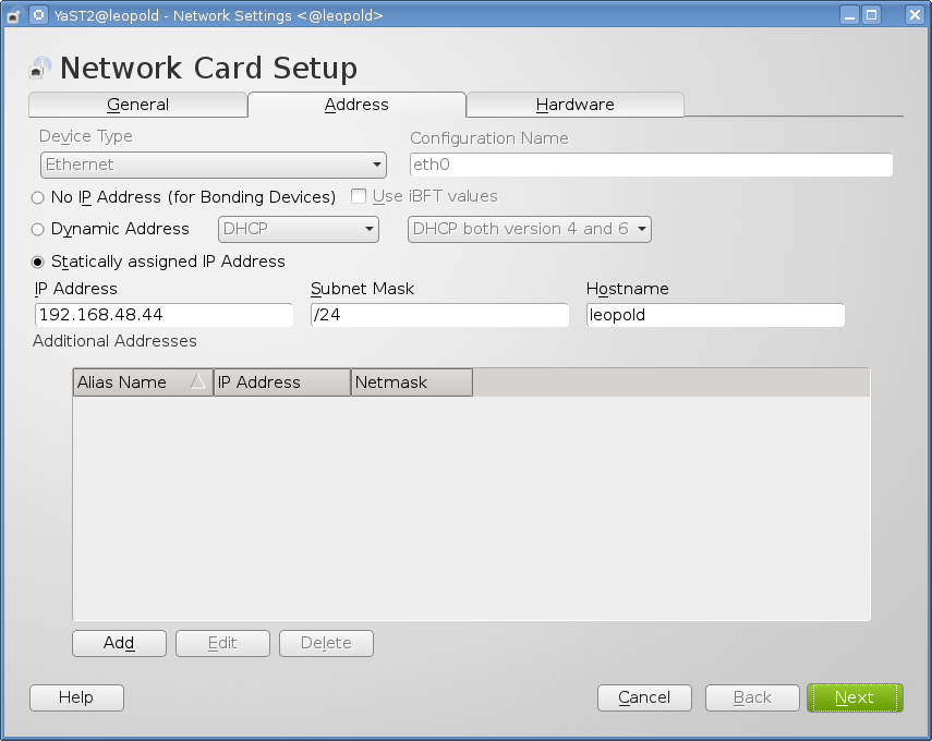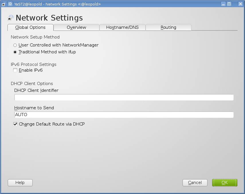 Как и в любом десктопном Linux'е по-умолчанию в openSUSE включен NetworkManager, который для системы со статическим IP-адресом является скорее обузой, чем пользой. К счастью, openSUSE не забыла свои корни (я о SuSE Linux Enterpise) и умеет также конфигурироваться через ifup.