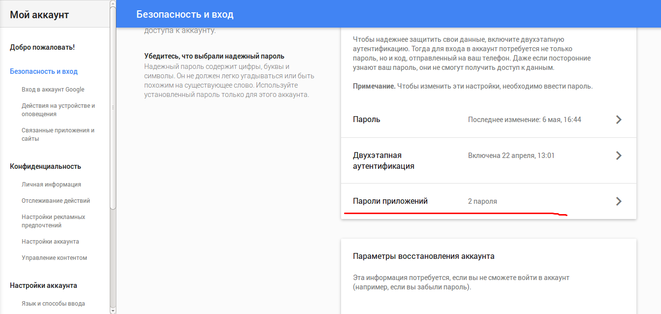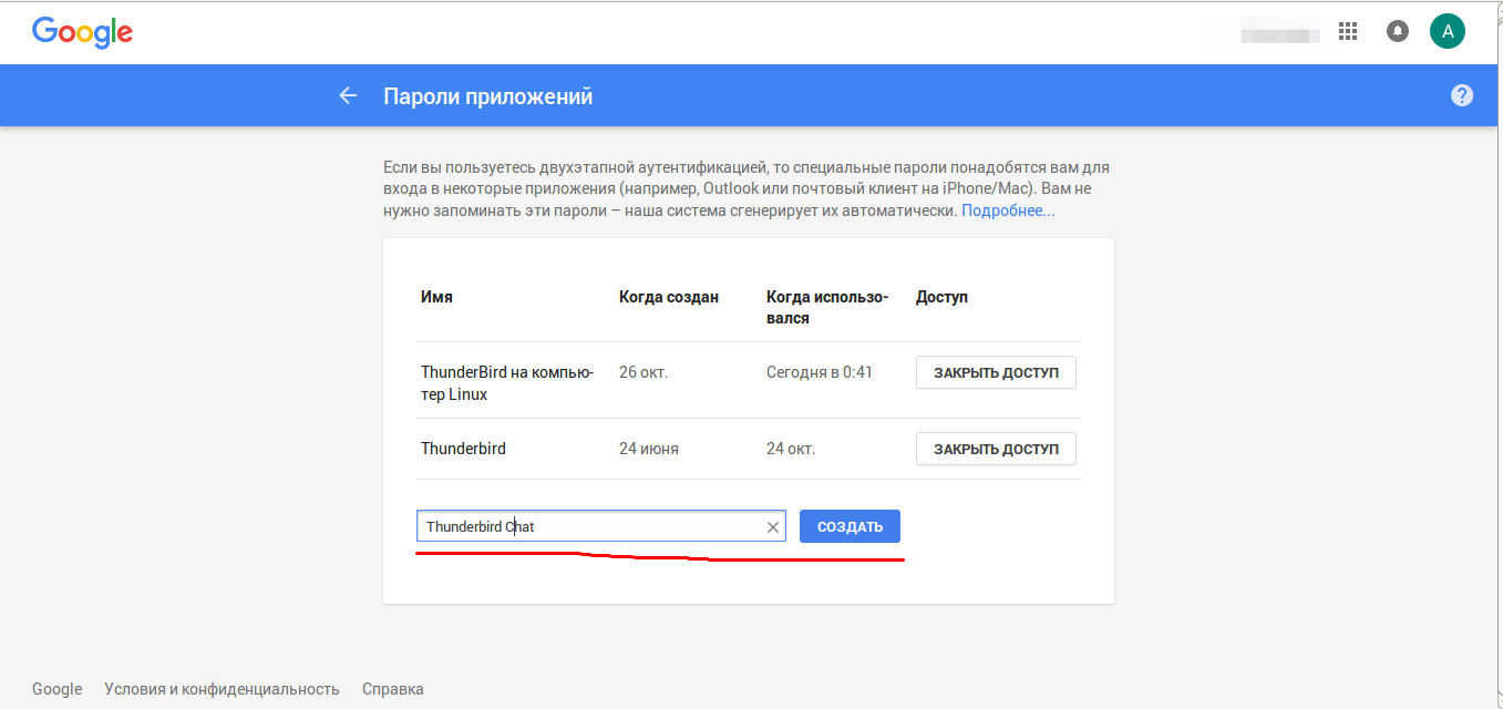 Чтобы сгенерировать пароль для Thunderbird необходимо войти в свой почтовый аккаунт google.