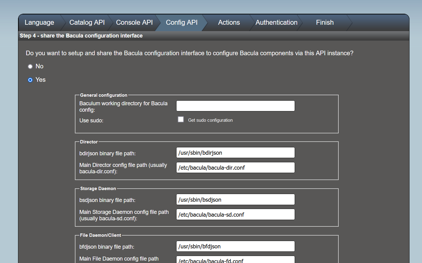 Далее Baculum предложит указать ему местонахождение других компонентов, например таких как Storage Daemon, но поля не позволяют указать адрес сервера в случае если компоненты Bacula распределены между разными машинами: