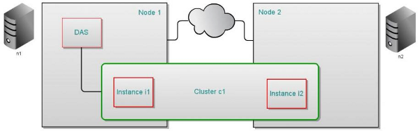 Наш кластер будет развёрнут на двух физических машинах - node1 и node2. Domain Administration Server (DAS), в идеале, надо было бы вынести на третью машину, но мы, с целью упрощения описания, этого делать не будем, и оставим его на node1. В итоге, архитектура нашего кластера примет следующий вид: