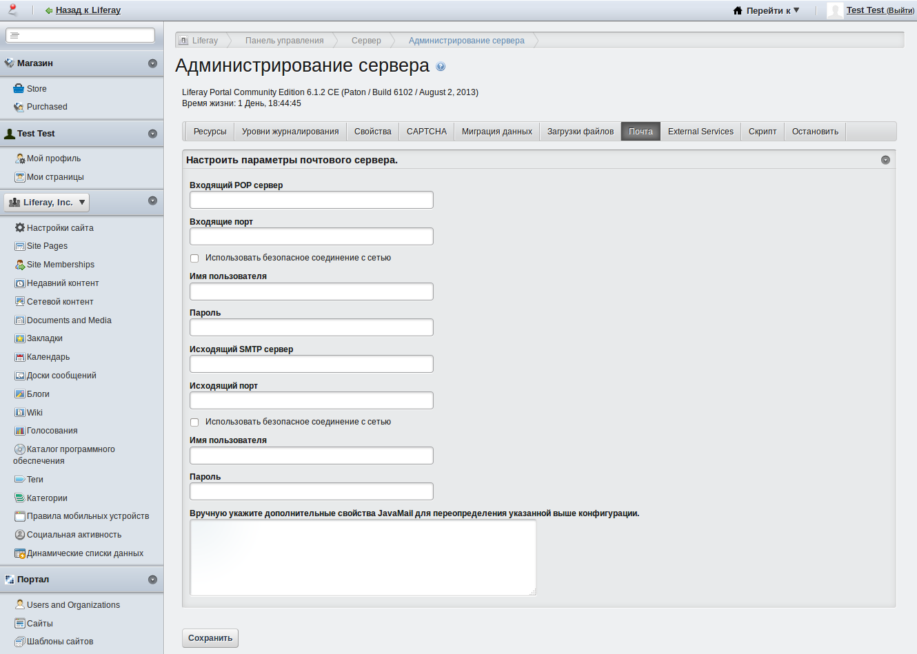 Рис.1 Интерфейс настройки параметров почтового сервера в Liferay