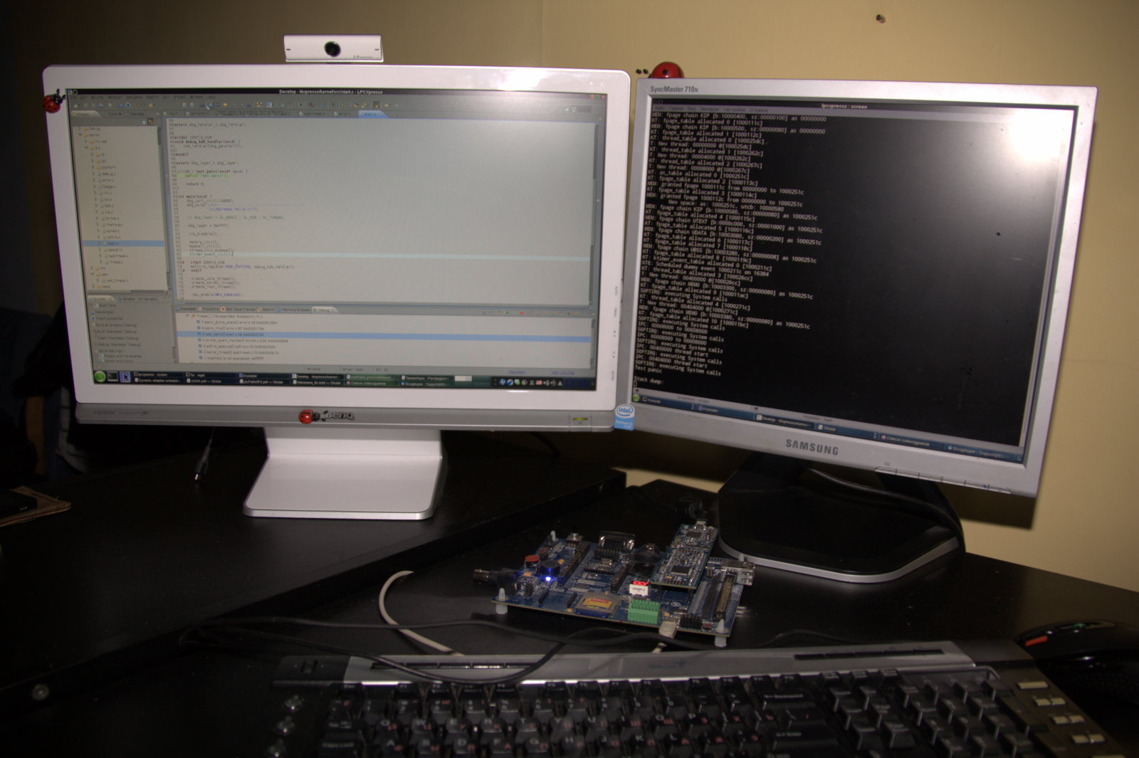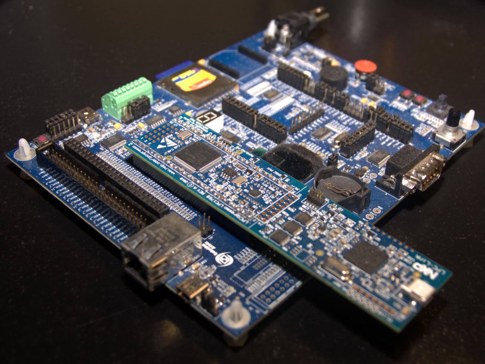 Так как направление моего обучения было связано с встроенными системами - платформа тоже оказалась  с микроконтроллером Cortex-M3 (в те времена его активно пиарили, и потому железка обошлась сравнительно дешево: 1000 рублей за плату LPCXpresso от NXP (подразделение Philips) с LPC1768 и 100 евро за Base Board с различными и нтерфейсами ввода-вывода, в том числе USB-2-Serial, OLED-дисплеем, динамиком и Ethernet. В отличие от x86 - Cortex-M3 оказался очень простым для программирования процессором: например обработчики прерывания в нем - сишные функции.