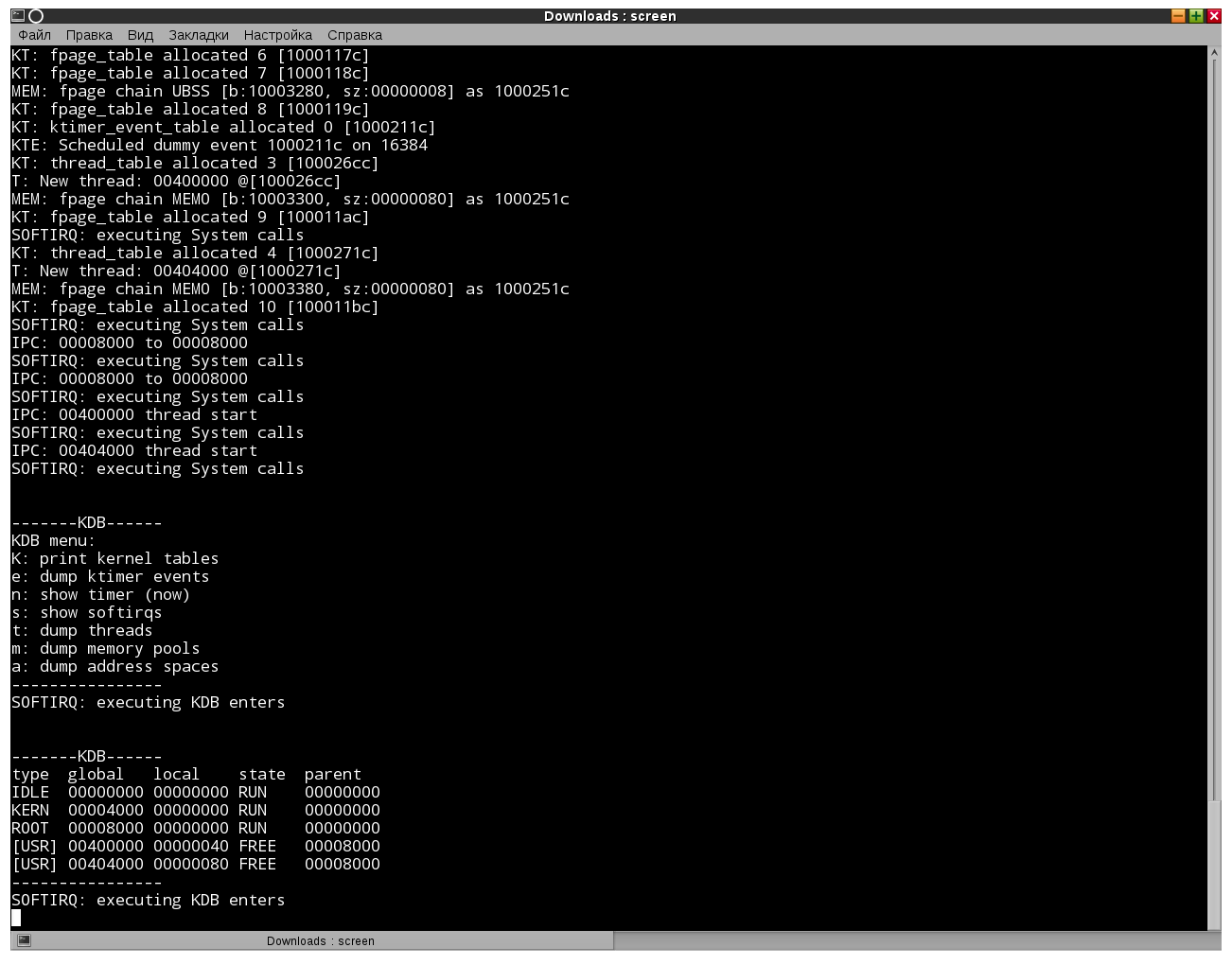 И наконец, отладчик ядра. Хотя в отличие от традиционных систем, в которых отладка внешними средствами затруднена и требуется полная реализация отладчика внутри ядра (kmdb в Solaris, kgdb в Linux), в случае L4Xpresso это можно выполнить средствами среды LPCXpresso. Однако такие вещи, как например состояние управляющих структур ядра лучше реализовывать отдельно. Для этого в L4Xpresso и предусмотрен отладчик. Он срабатывает на передаваемый по UART3 (этот же интерфейс используется и для отладочной печати символ и печатает в удобном виде текущее состояние системы, например список текущих потоков, как показано на скриншоте.
