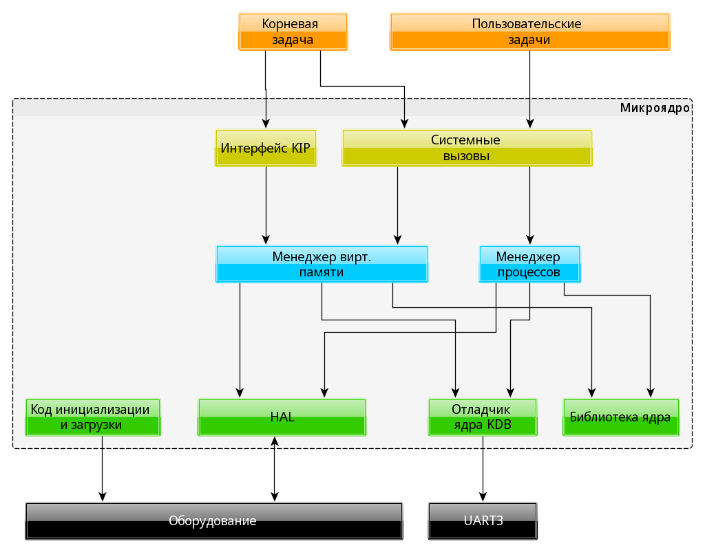 Верхний уровень представляют из себя интерфейсы ядра: первый состоит из 13 системных вызовов, второй интерфейс - KIP (Kernel Information page) - служит для получения информации из ядра без собственно совершения системного вызова - соответсвующая область памяти всегда отображена в адресное пространство процесса. KIP описан в файле kernel/include/l4/kip.h Средний уровень представлен основными подсистемами ядра: в первую очередь менеджерами виртуальной памяти и процессов (задач). На нижнем уровне же располагаются библиотека ядра, слой аппаратных абстракций, отладчик ядра и код инициализации и загрузки системы. Разберем нижний уровень микроядра L4Xpresso подробнее.